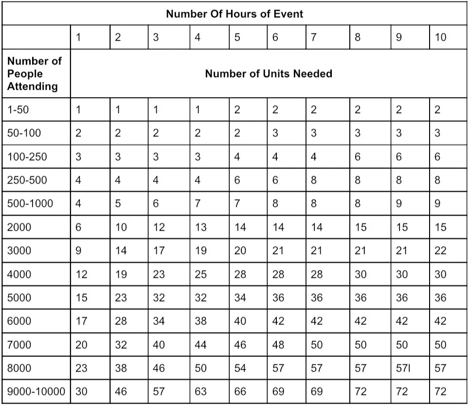 Determine the approximate duration of the event as well as the approximate amount of guests attending and calculate these figures using the chart to determine the amount of portable restrooms that will be needed to maintain the events sanitary needs.
